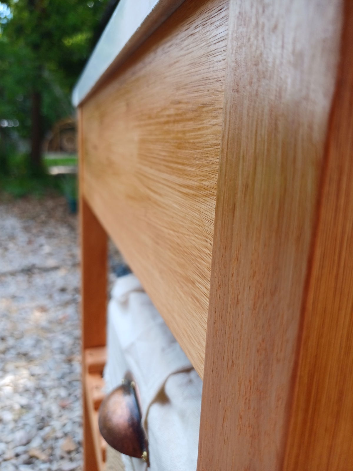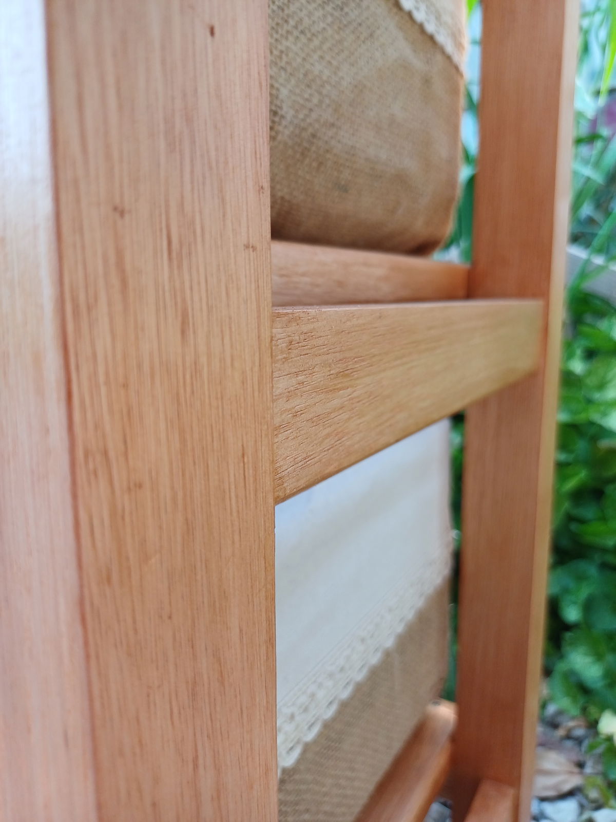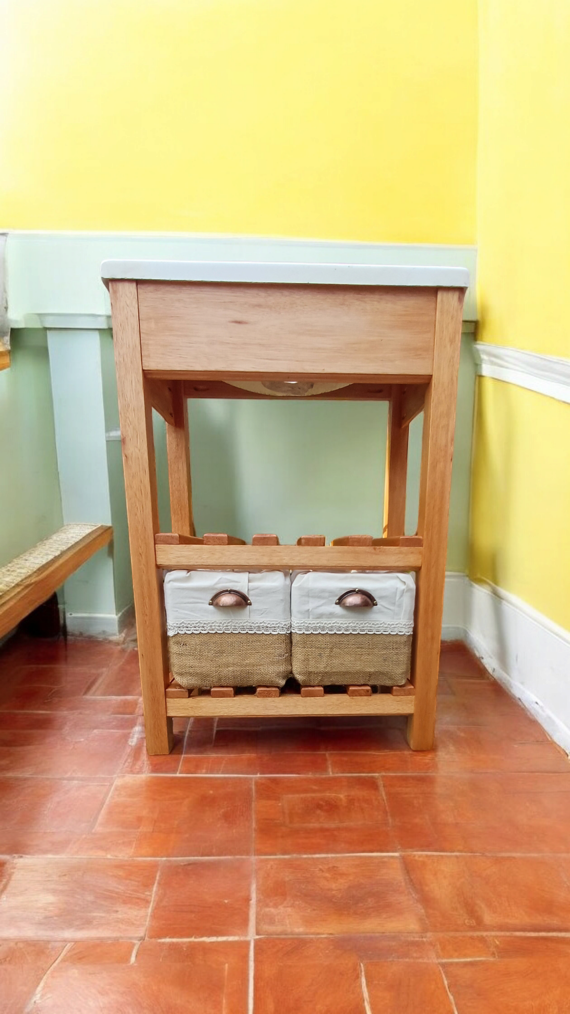 Cajones fabricados artesanalmente con madera maciza y telas, tiradores.